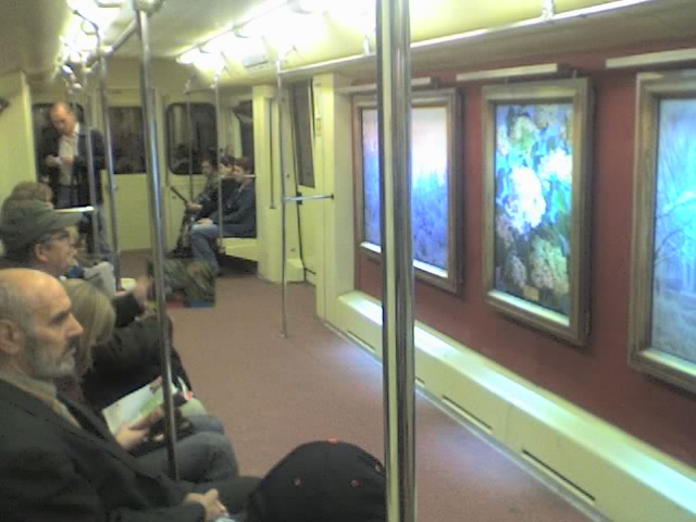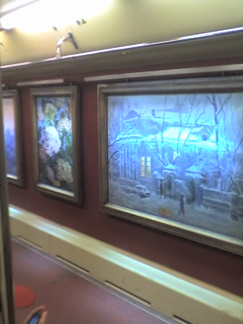 2. Очень прекарсно, когда садишься на Парке Победы в новый, модный, комфортный вагон...Напротив тебя прекрасные творения художника...И наслаждаешься этим чудом ты около 3 минут, т.к. на Киевской, вагон заполняется пассажирами, которым так же интересно посмотреть картины, и тебе приходится до своей остановки любоваться уже совсем другим изображением.