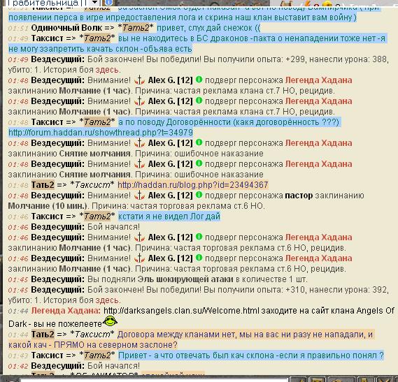 Почему удаляются мои ответы Страху? Придется повторить. Взаимный кач пути в окрестностях между кланами Атланты и ТсД продолжается больше года. Конфликтов уже около года- не было. До тех пор пока клан ТсД не сделал официальное заявление на форуме http://forum.haddan.ru/showthread.php?t=50714 (нападения на всех кого они захотят по их желанию без кача пути с возвратом дропа "по желанию") Что вскоре и проявилось http://haddan.ru/blog.php?id=39814067 кача пути нет и не рекрут напал- сам Страх. Лог более раннего по времени нападения на ТсД- пути разные. Ни одного факта нападения без кача пути или возврата дропа на клан ТсД до начала ими откровенно шакальских нападений Страх привести не может. Согласия на такие нападения на себя Атланты клану ТсД не давали и без ответа они естественно не остались. Поэтому если у ТсД есть логи нападений на них без кача пути до 11.09.008 00:39 пусть выкладывают. Если нет- Не надо юлить, надо просто сказать мы "Нападаем на кого хотим и дроп не возвращаем, а за юзанье калечки - объявляем войну". Сказано все- больше не вижу смысла обращать внимание на данный топ.