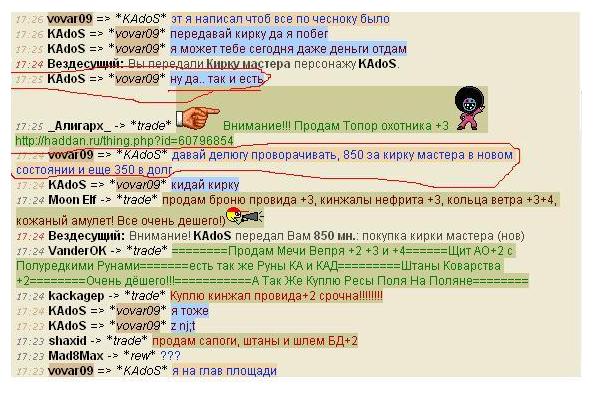 2. http://haddan.ru/user.php?id=285130 3. фин. прокачка с инкарнаций Сота Сил, Владыка Рассвета, через Fitis и DIMONhunter, ст. 36 НТХ. 3. Мною было продано 150 мдк (Владыка Рассвета), 500 мдк (Сота Сил). Мдк были переданы в шахте, а деньги были переведены на ячейки. Наказание снято. Будте внимательнее. Подобные передачи лучше оформлять на форуме. Последний раз редактировалось _Sam_, 10.05.2008 в 02:11. |